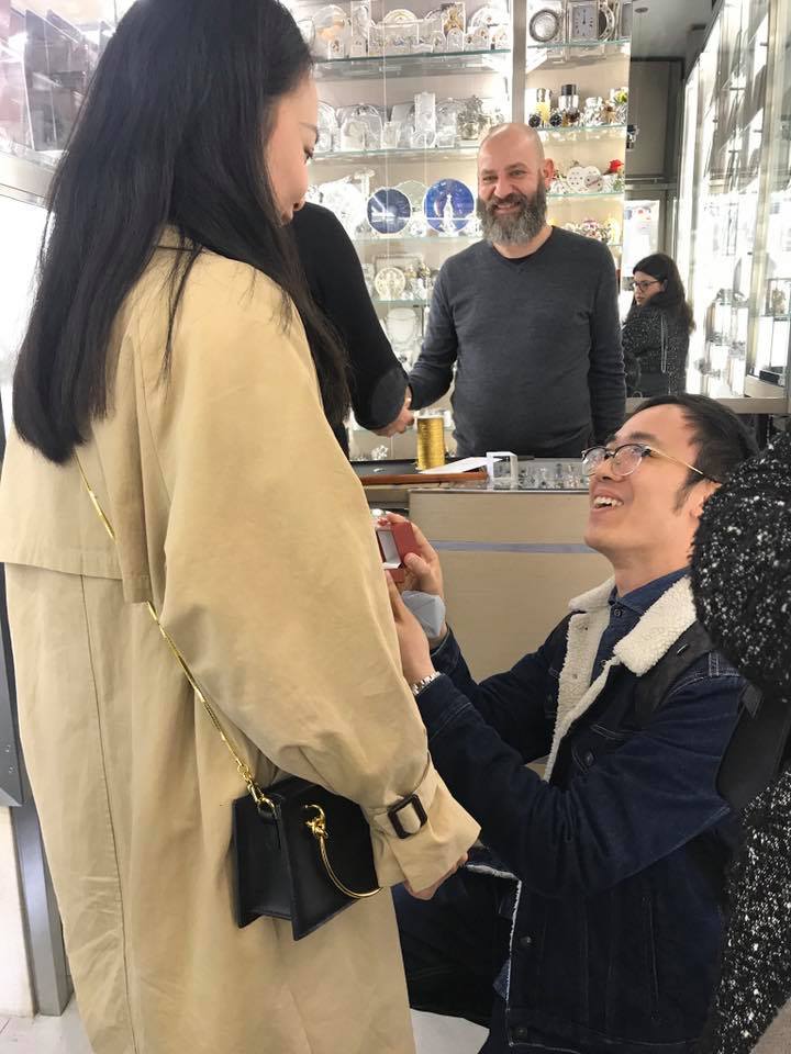 Così spiegano i titolari: “Sono entrati in negozio timidi, poi lui le ha donato un bouquet di rose rosse e un anello di fidanzamento. Si è inginocchiato davanti a tutti noi e tenendole la mano le ha dichiarato amore per sempre”.