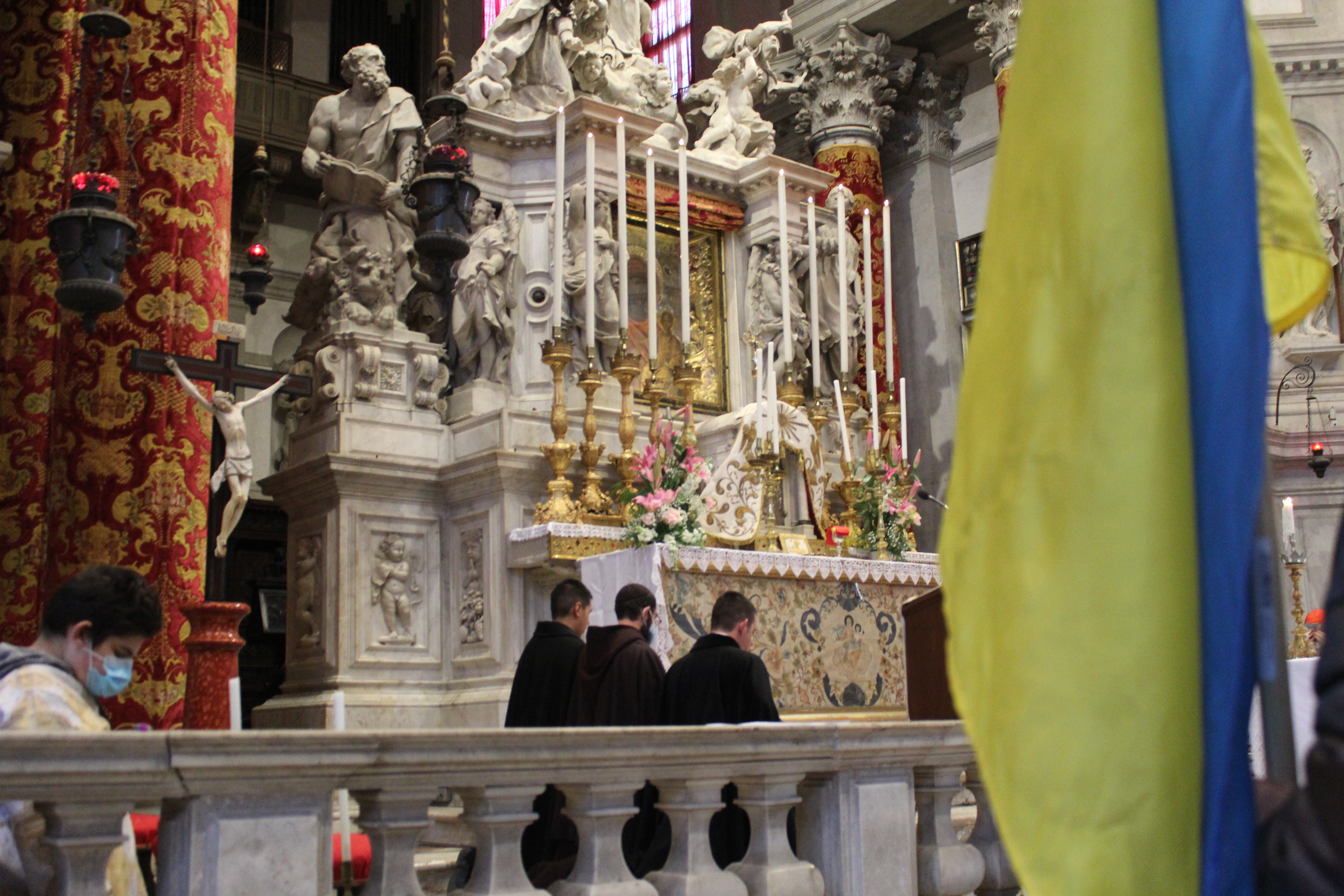 Nella Basilica della Madonna della Salute la bandiera blu e gialla dell’Ucraina. Il Patriarca Francesco Moraglia ha accolto i fedeli della ComunitĂ ucraina greco-ortodossa e insieme hanno pregato per la pace.