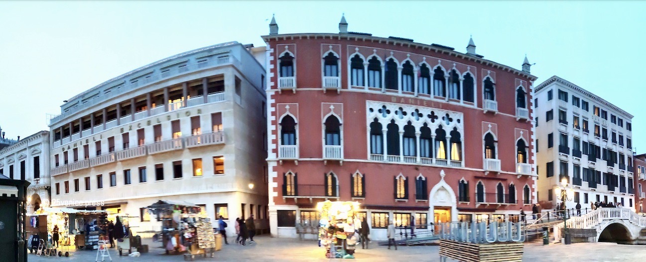 Dandolo, Casa Nuova, Danieli Excelsior (Danielino), vale a dire tre palazzi in uno collegati da ponti sospesi e affacciati sulla laguna in Riva degli Schiavoni.