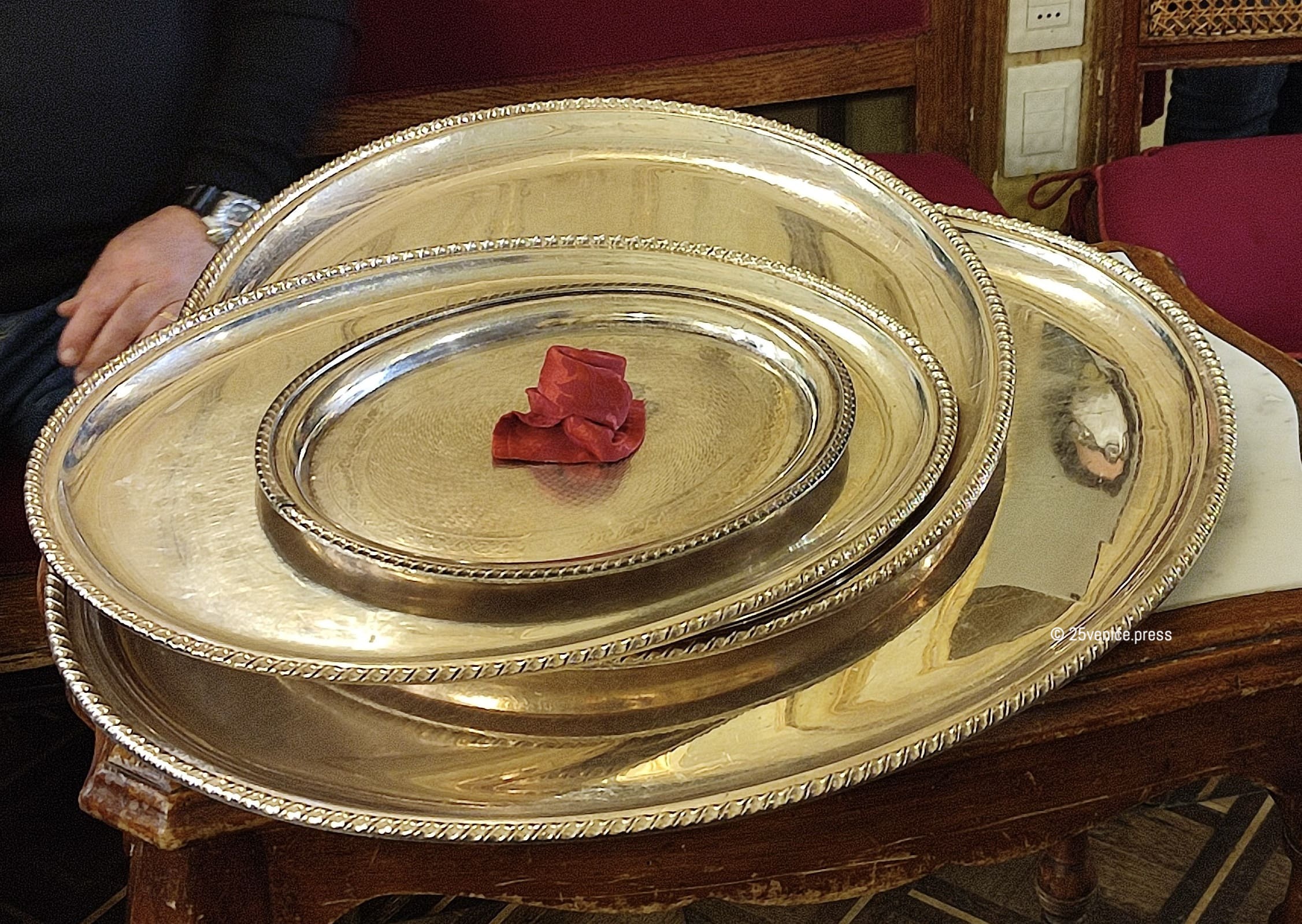 Di pari passo al vassoio va la tipologia del servizio, all’italiana, all’inglese, alla russa, alla francese, self–service. “Nella formazione alberghiera la questione delle prese non era mai stata trattata nei libri scolastici”, osserva orgoglioso il maÎtre Igor. Sei sono le prese: pinza (semplice e sicura), palmo piatto (la più difficile), palmo chiuso (elegante), cambio mano (utile in spazi ristretti), alzata (per lunghe distanze e vassoi pesanti), incrocio (per trasportare contemporaneamente 3 vassoi). E sei le sale del Florian: Liberty, Cinese, del Senato, degli Uomini Illustri, delle Stagioni, Orientale. Igor Battistin aggiunge la settima presa. Si chiama incrocio Battistin o Igoriano e permette di servire una mise en place per 4 persone contemporaneamente.