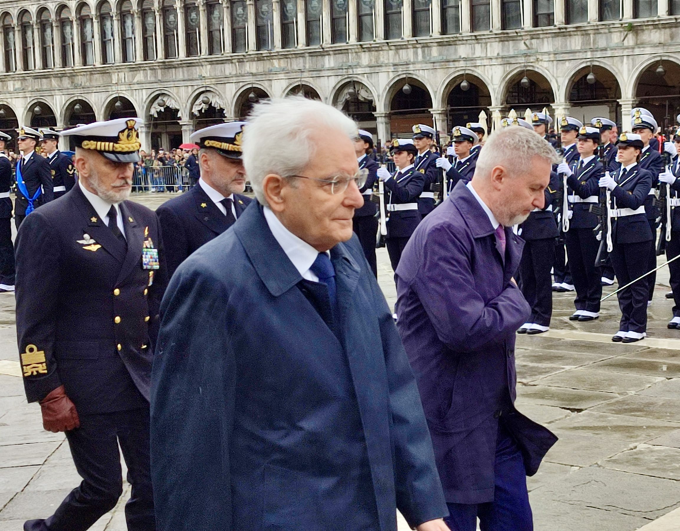 In Piazza San Marco 21 colpi di cannone a salve del cacciatorpediniere “Luigi Durand De la Penne” (ancorato in Bacino) hanno accolto il presidente della Repubblica Sergio Mattarella sbarcato in laguna per festeggiare i 60 anni della Scuola navale militare “Francesco Morosini”. Ad accompagnarlo il ministro della Difesa Lorenzo Guerini. I primi a vedere da vicino il presidente Mattarella nel “salotto” più bello del mondo i bambini della scuola elementare Foscarini. Quando il Presidente gli si è avvicinato i piccoli hanno iniziato a sventolare forte le bandierine italiane. Il Presidente ha attraversato la Piazza e passato in rassegna tutti i reparti schierati. Nel frattempo le massime autorità civili, militari e religiose avevano trovato posto nel palco d’onore. Tra queste il Capo di Stato Maggiore della Difesa Ammiraglio Cavo Dragone e il Capo di Stato Maggiore della Marina Militare Ammiraglio di Squadra Enrico Credendino. Tra le autorità civili il sindaco di Venezia Luigi Brugnaro e il presidente della Regione del Veneto Luca Zaia. Per il Morosini il cappellano don Giovanni Medeot, per la diocesi veneziana monsignor Orlando Barbaro.