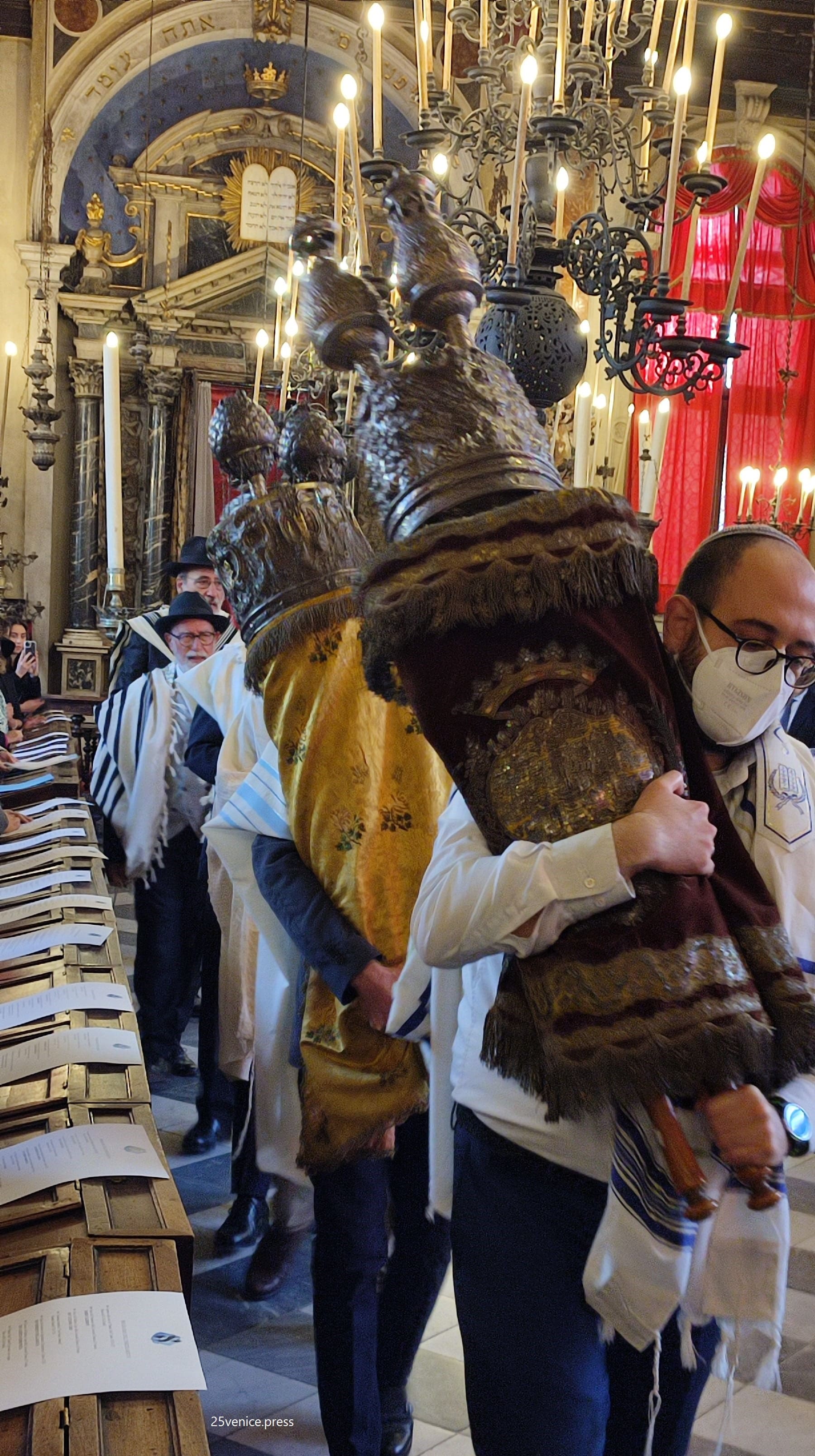 Momento clou è stata la benedizione impartita dal neo rabbino capo e l’uscita dall’Arca Santa dei sette rotoli della Torah adornati con antichi paramenti che sono stati portati in processione in sinagoga. La cerimonia è iniziata in Campo del Ghetto Novo alle 11,30 con la deposizione di una corona d’alloro al monumento alle vittime della Shoah in ricordo delle 246 vittime veneziane della deportazione nazista.