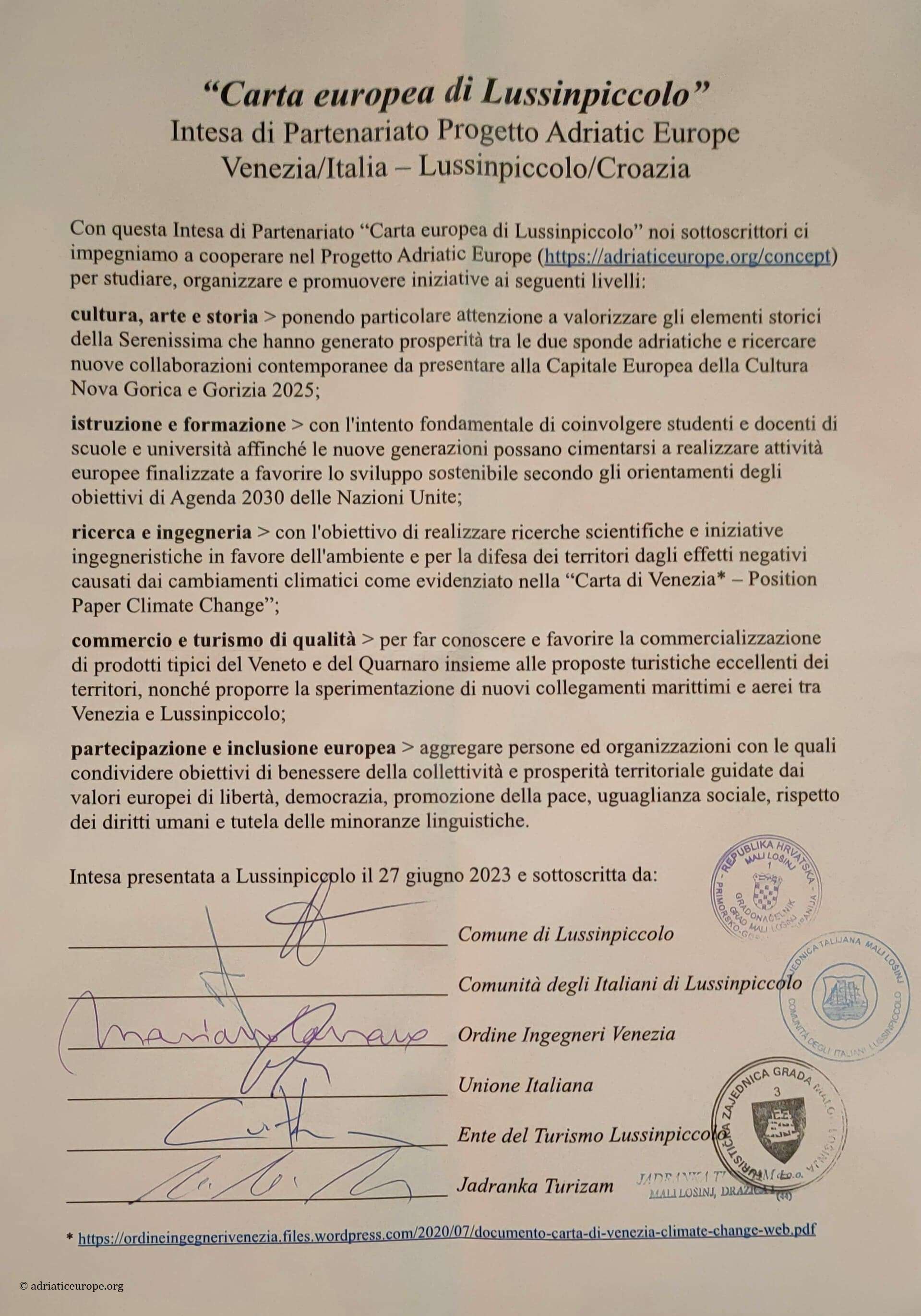 Importante la firma della “Carta europea di Lussinpiccolo” siglata da parte di 6 soggetti (Comune di Lussinpiccolo, Comunità Italiana degli Italiani, Ordine Ingegneri Venezia, Unione Italiana, Ente del Turismo Lussinpiccolo, Jadranka Turizam).