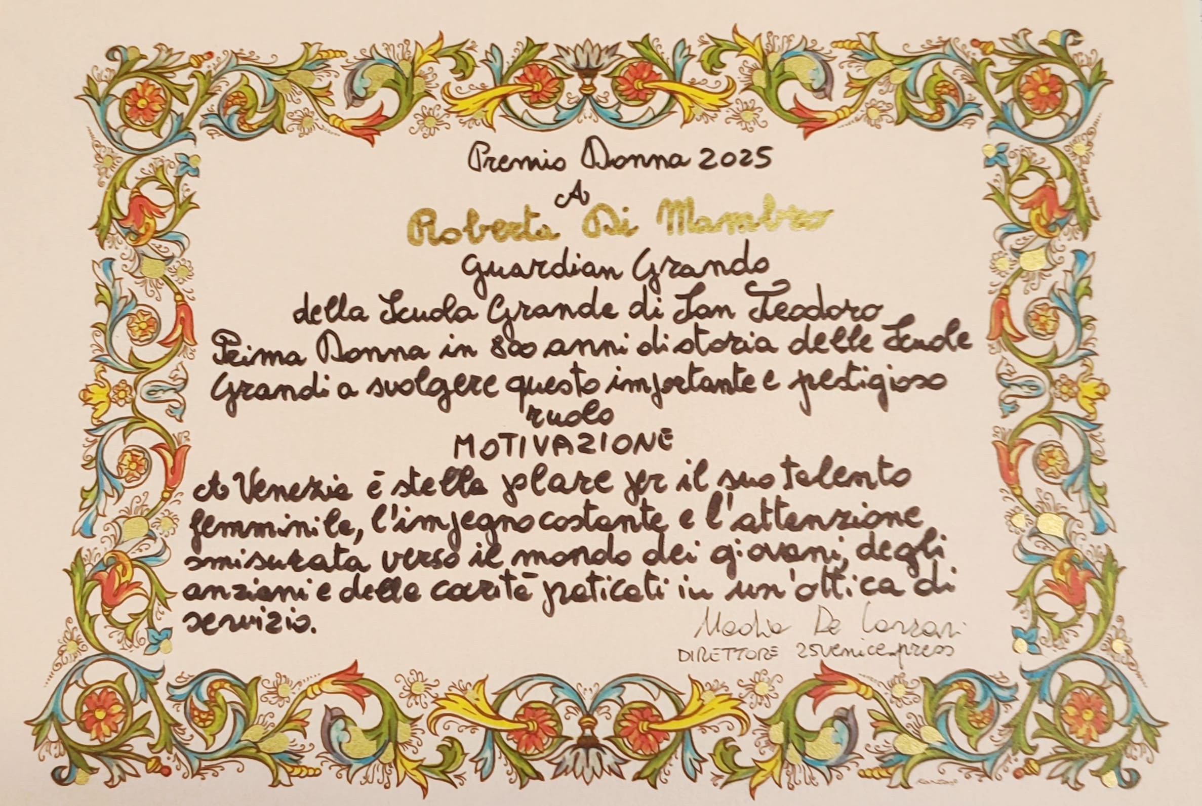 Il premio – leone di San Marco d’argento di Meneghetti l’orafo di Venezia – è stato consegnato alla veneziana Roberta Di Mambro, Guardian Grando della Scuola Grande San Teodoro, prima e unica donna in 800 anni di storia delle Scuole Grandi a svolgere questo importante e prestigioso ruolo.