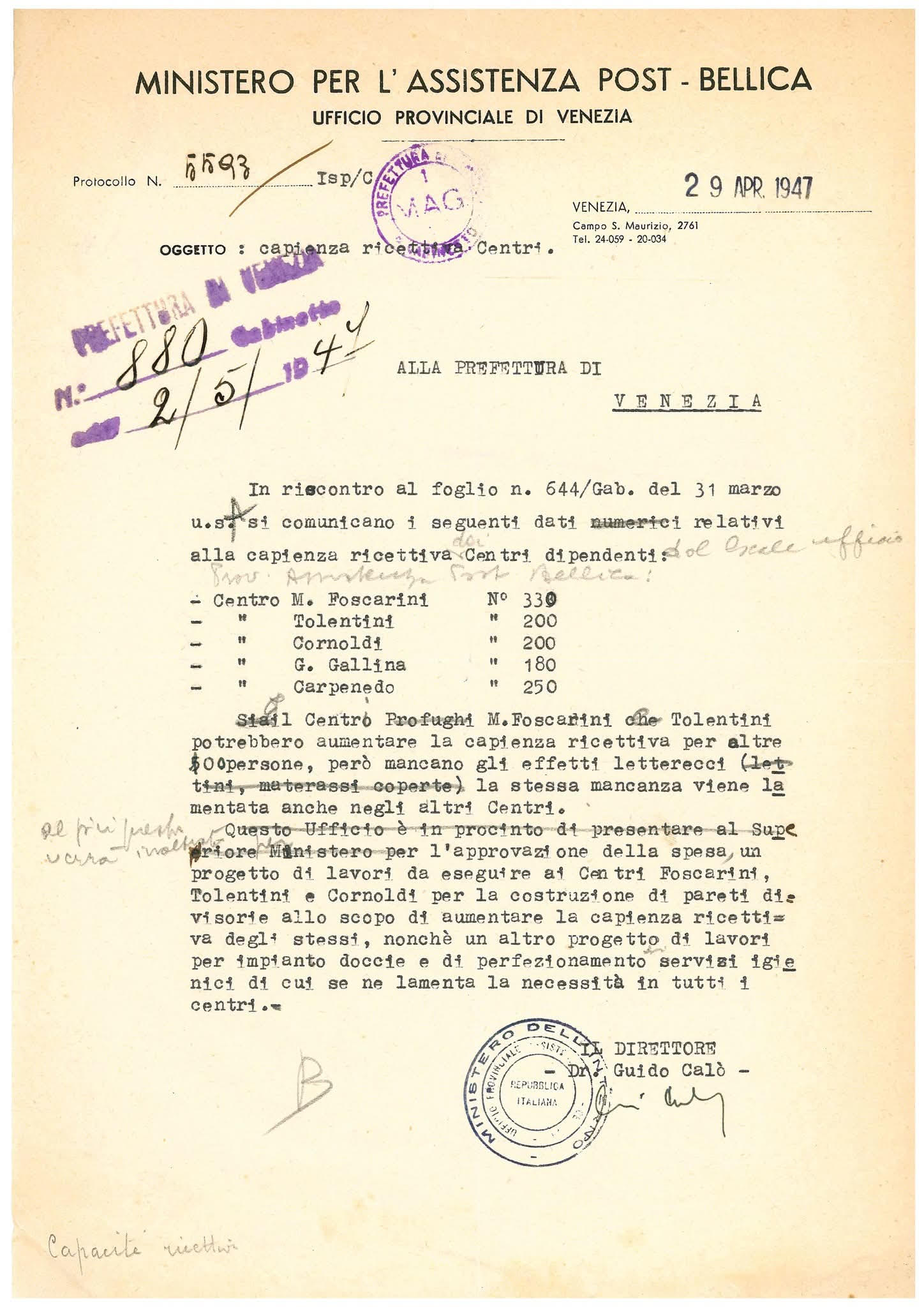 Secondo una nota del Ministero per l’Assistenza Post-Bellica, Ufficio Provinciale di Venezia, datata 29 aprile 1947, la capienza complessiva dei cinque Centri profughi veneziani ammontava a 1.160 posti. In particolare, il centro allestito presso il Liceo Marco Foscarini poteva ospitare 330 persone, seguivano i Tolentini e il Cornoldi con 200 posti ciascuno, il Giacinto Gallina con 180 e Carpenedo con 250.