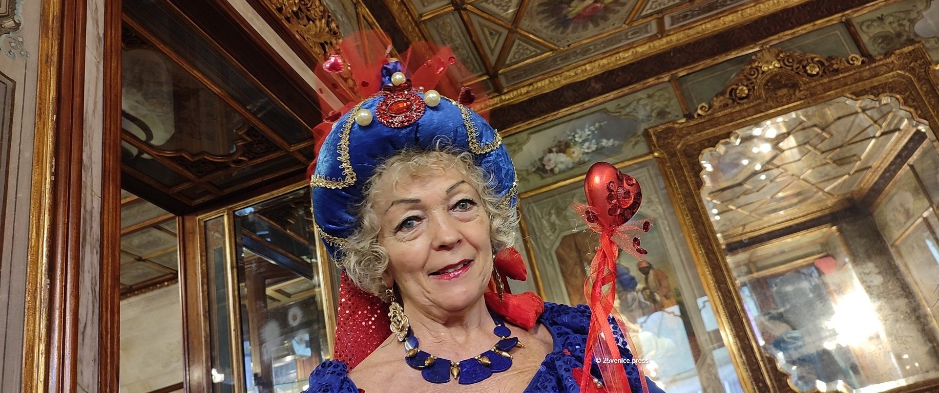 Da quarant’anni, durante il Carnevale, mantiene viva una piccola grande tradizione personale, ossia confeziona un costume nuovo. Lo realizza da sé, con cura artigianale e fantasia. Ogni anno un’idea diversa, ogni anno un incanto. Quello di quest’anno è un omaggio a San Valentino. “O, meglio, a Santa Valentina”, spiega sorridendo. È un tripudio di cuori di velluto, perline e paillettes che brillano sotto le luci delle sale storiche del Florian. Un costume romantico, delicato e quel tocco ironico che la rappresenta. Perché Gianna non si limita a indossare un abito, lo abita, lo fa vivere, lo racconta.