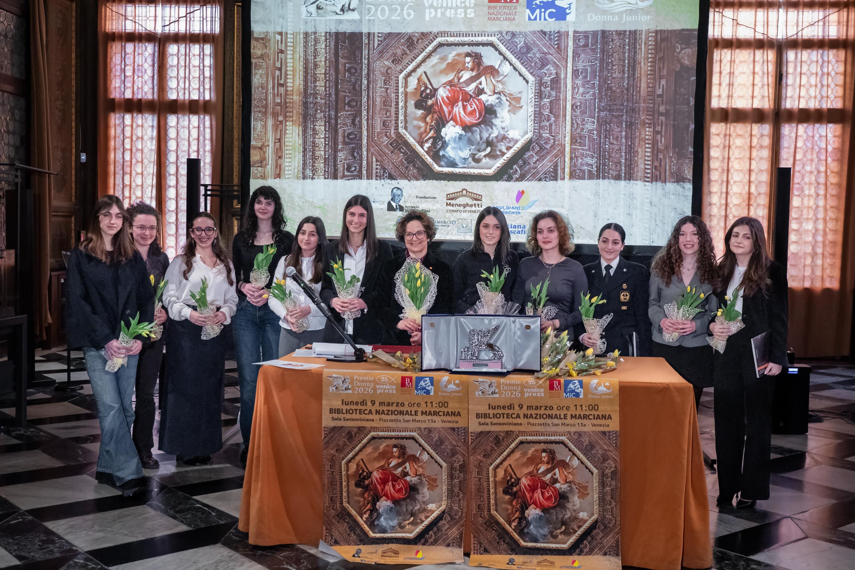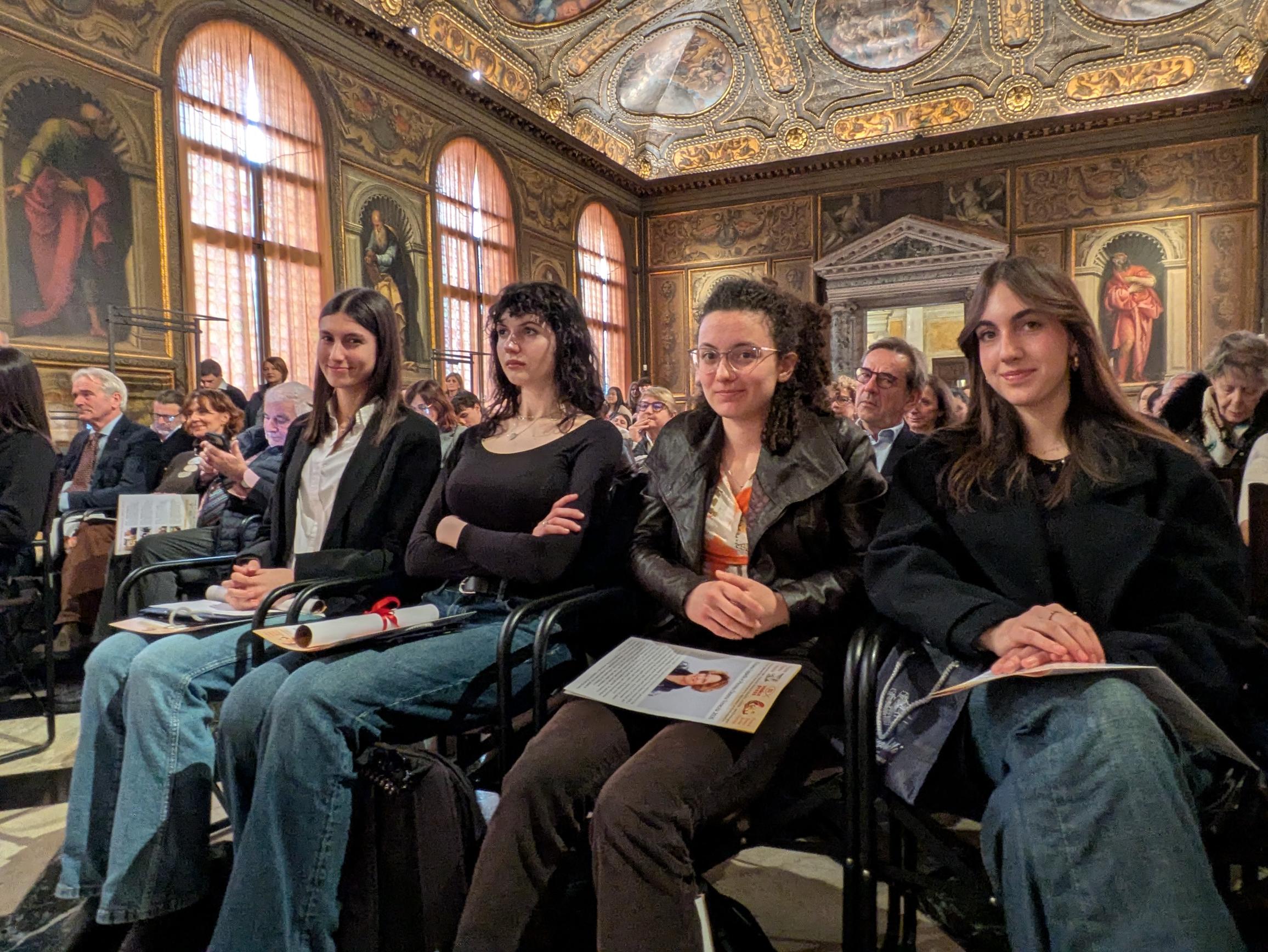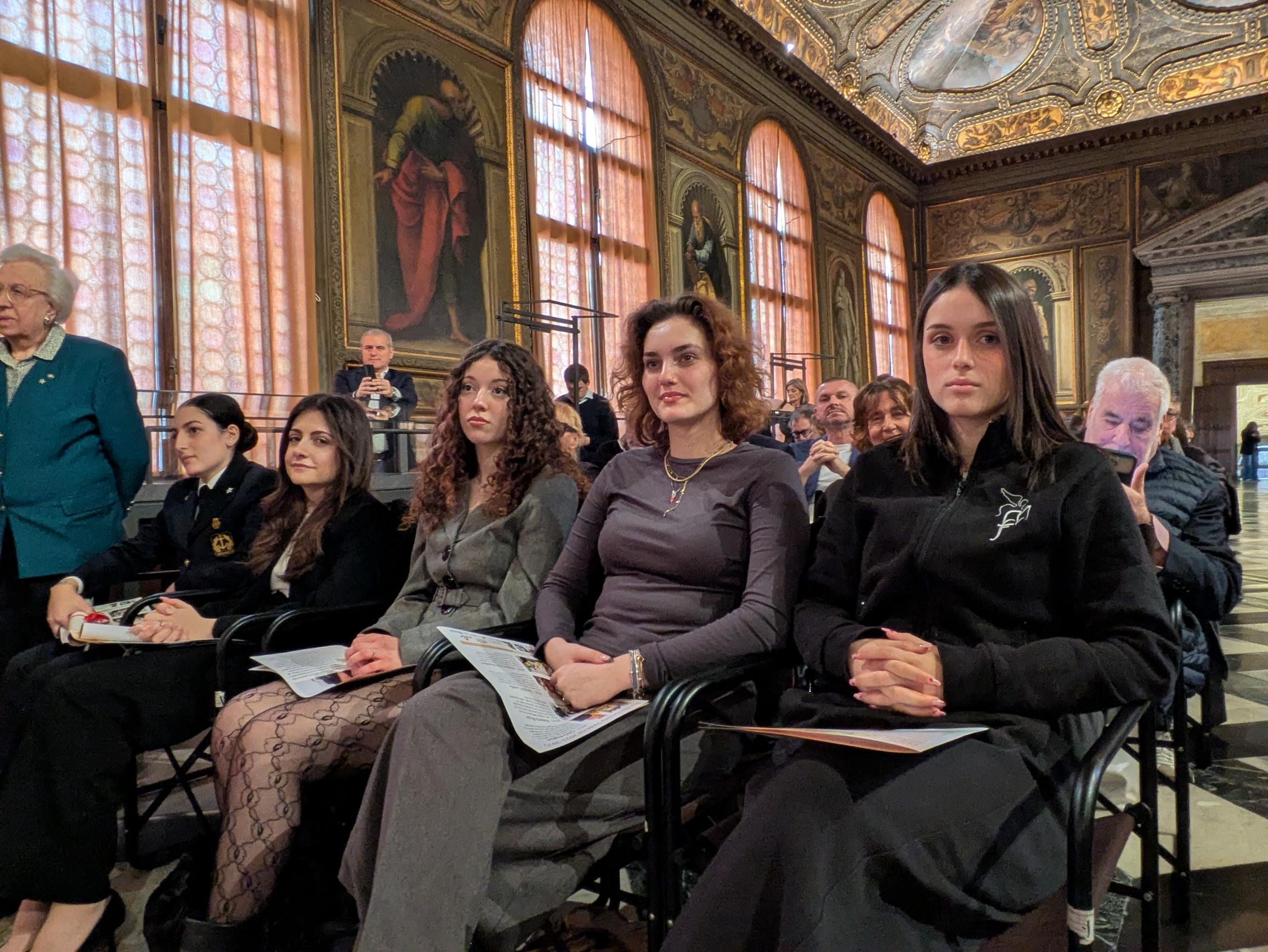 Nella splendida Sala Sansoviniana che custodisce arte, libri e memoria i premi hanno messo simbolicamente in dialogo generazioni diverse. Dalla Rettrice ai dirigenti scolastici, dagli insegnanti alle giovani studentesse premiate, dalle past Premio Donna ai partner. Un passaggio di testimone ideale sotto l’immagine simbolo dell’evento è “L’Allegoria della Sapienza”, opera di Tiziano Vecellio che dal 1560 campeggia sul soffitto della Libreria progettata da Jacopo Sansovino.