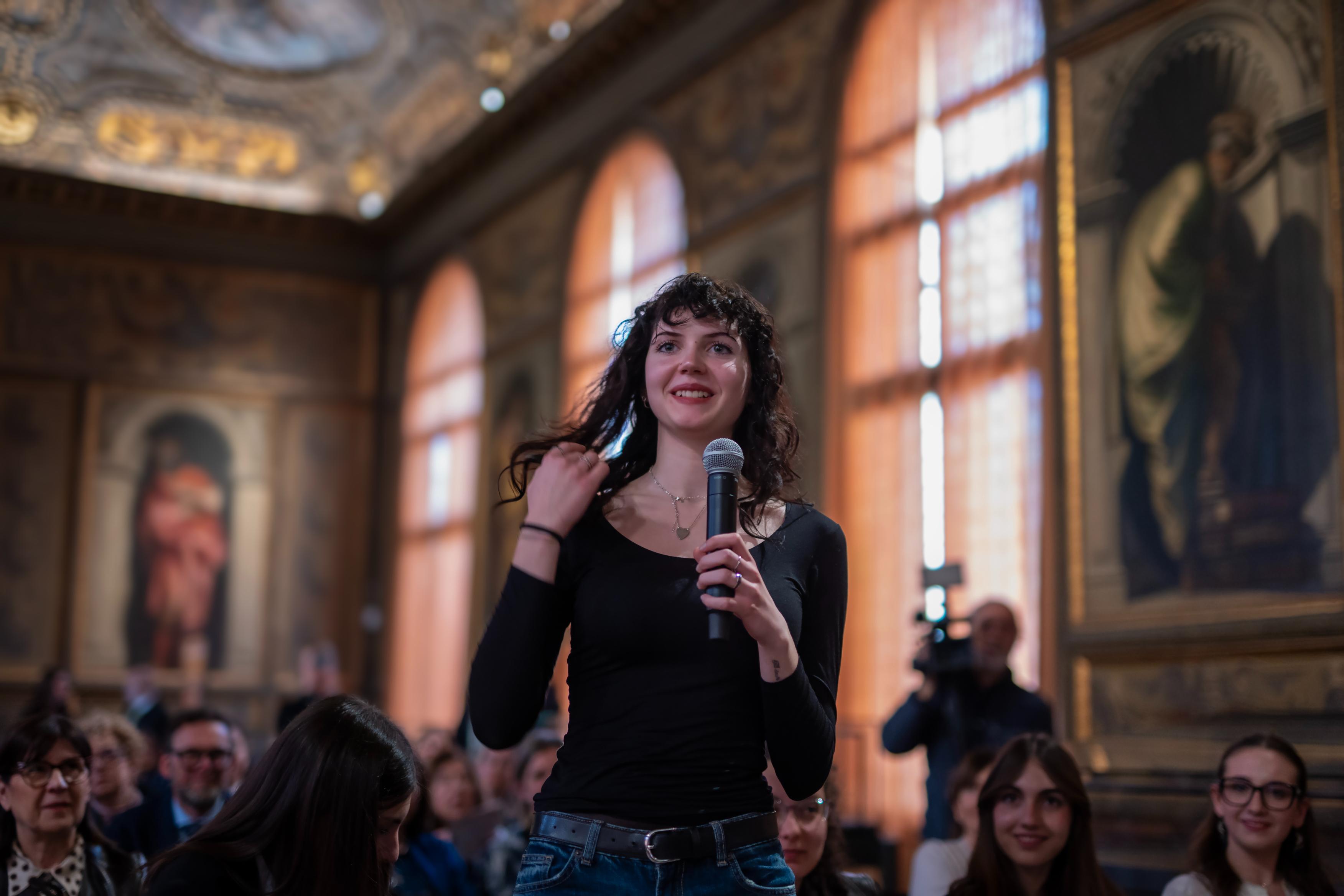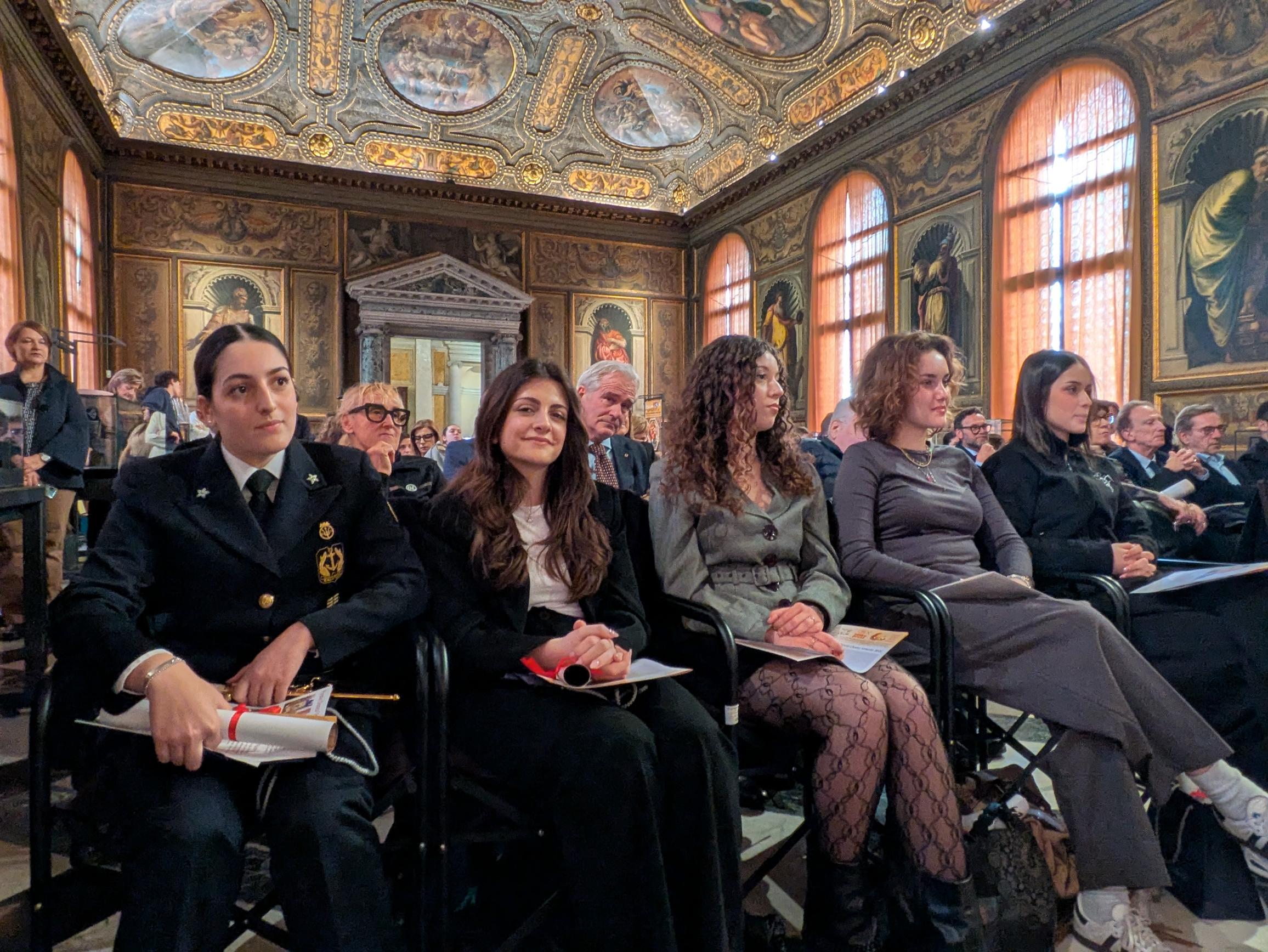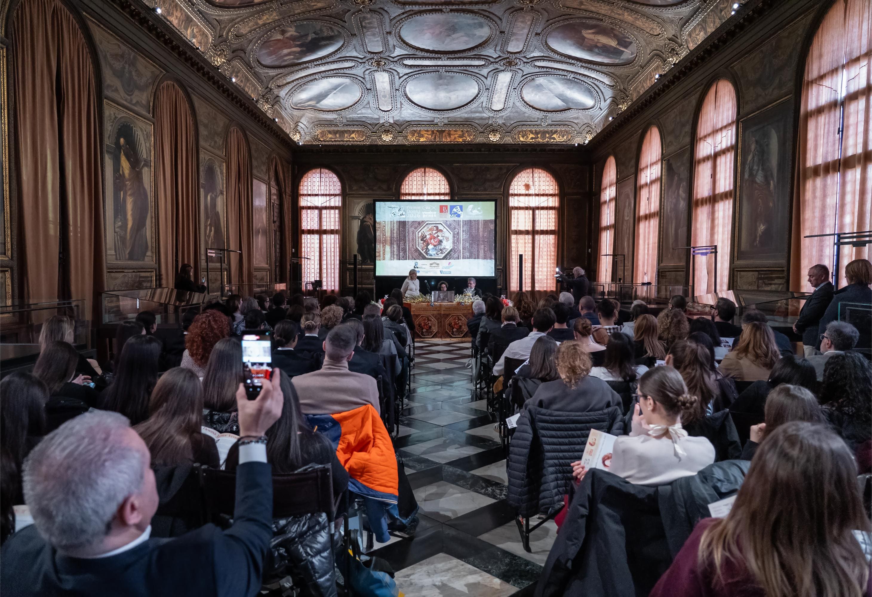 Nella splendida Sala Sansoviniana che custodisce arte, libri e memoria i premi hanno messo simbolicamente in dialogo generazioni diverse. Dalla Rettrice ai dirigenti scolastici, dagli insegnanti alle giovani studentesse premiate, dalle past Premio Donna ai partner. Un passaggio di testimone ideale sotto l’immagine simbolo dell’evento è “L’Allegoria della Sapienza”, opera di Tiziano Vecellio che dal 1560 campeggia sul soffitto della Libreria progettata da Jacopo Sansovino.